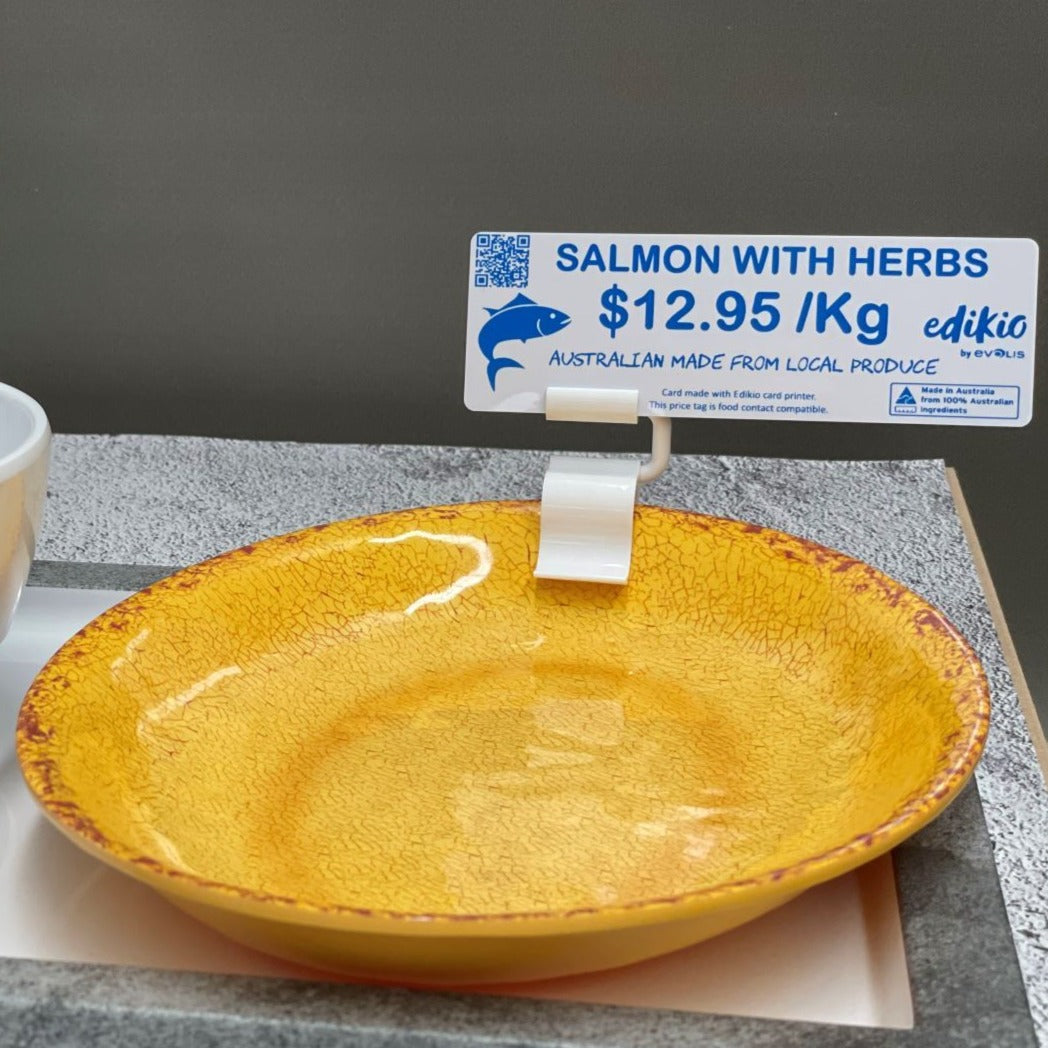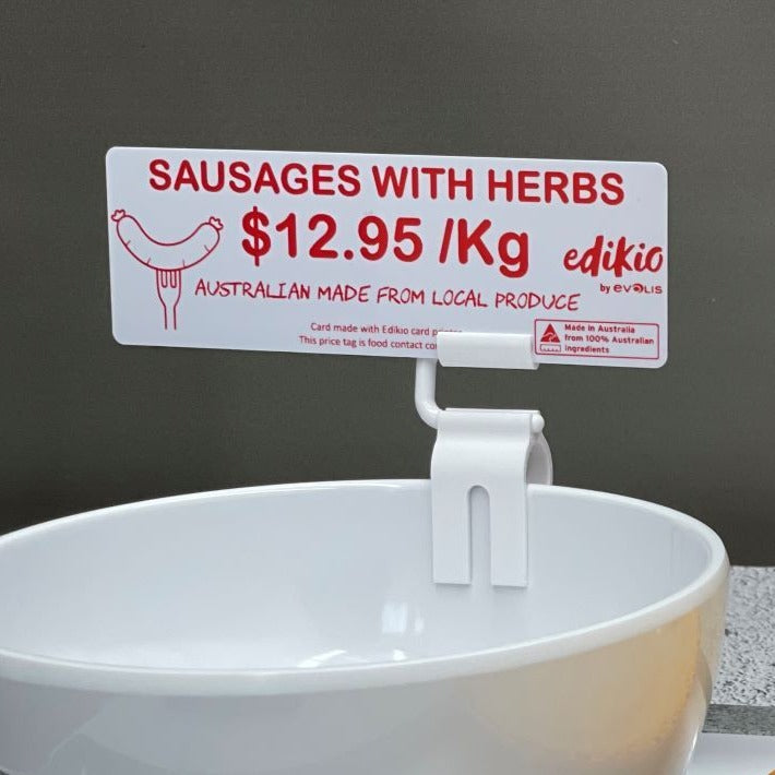 Mirror-finish White Cards to print longer Price Tags in the Edikio Flex Card Printers. The extra space on these cards provides room for extra information such as ingredients, allergens, origin, nutritional details and production methods. Long cards are also ideal for businesses that need to display information in a second language. They are a popular choice for bakeries and butchers in particular. The long format cards are flexible, for easy insertion into price rails. Use with Evolis monochrome ribbons in black, blue, red and green to highlight different areas in your display.