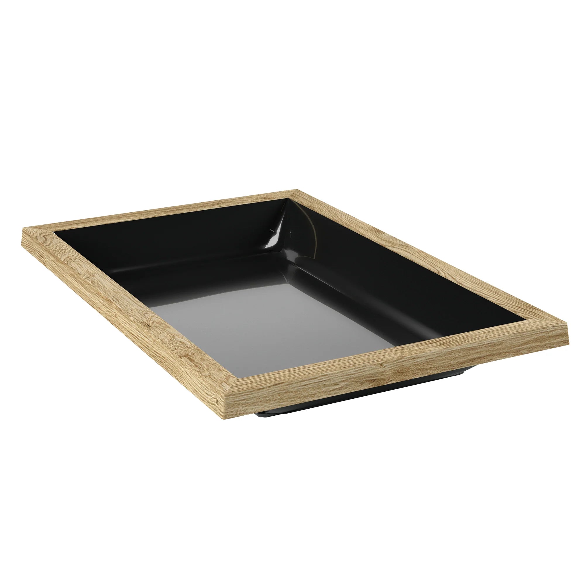 Fitting into our System 840 layouts, the new Tura Oak Wood Black Melamine Dish fit perfectly with the matching Frame platters. Two small dishes or platters (280x210) make up one large dish or platter (420x280). The wood effect edging on the black dish highlights your products.